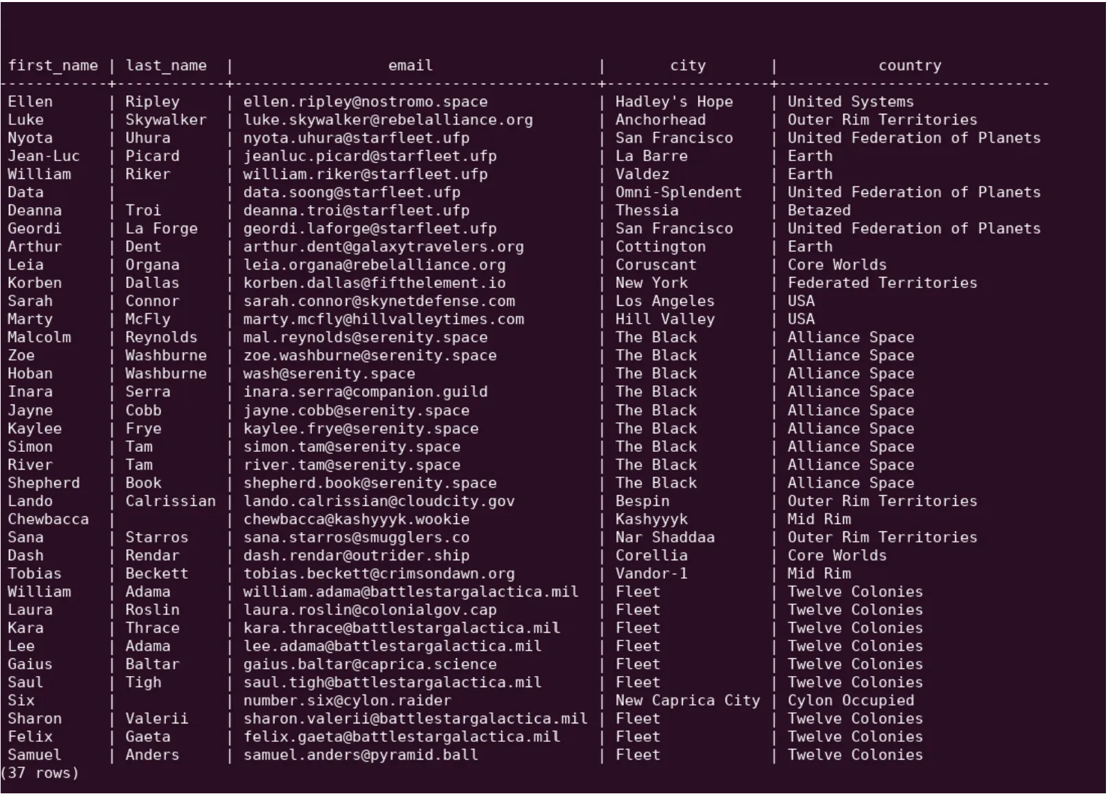 Let’s say that we are querying a customer's table. A simple “select first_name, last_name, email, city, country from customers" is going to get us started.
