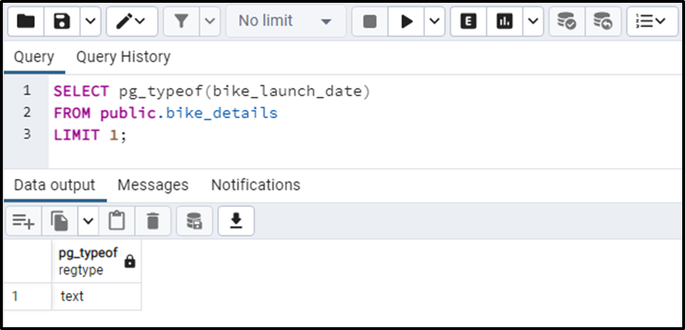The output shows that the “bike_launch_date” column has a “TEXT” data type.