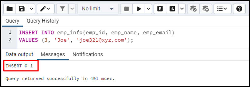 The above snippet shows that the INSERT query was executed successfully, and the stated error has been resolved. You can verify the inserted data using the SELECT query: