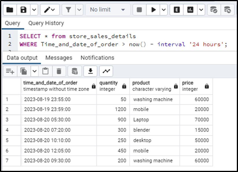 - The entire query will certainly retrieve all the data that has been inserted into the database over the past 24 hours. The resulting output is given below: