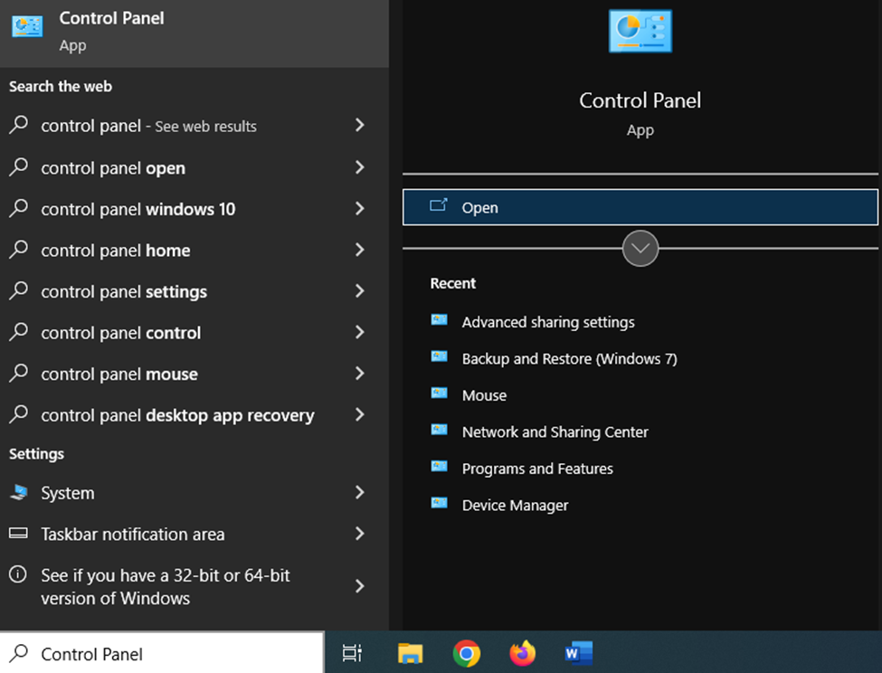 Go to the Windows Start menu and search for Control Panel, then click on it to open it:
