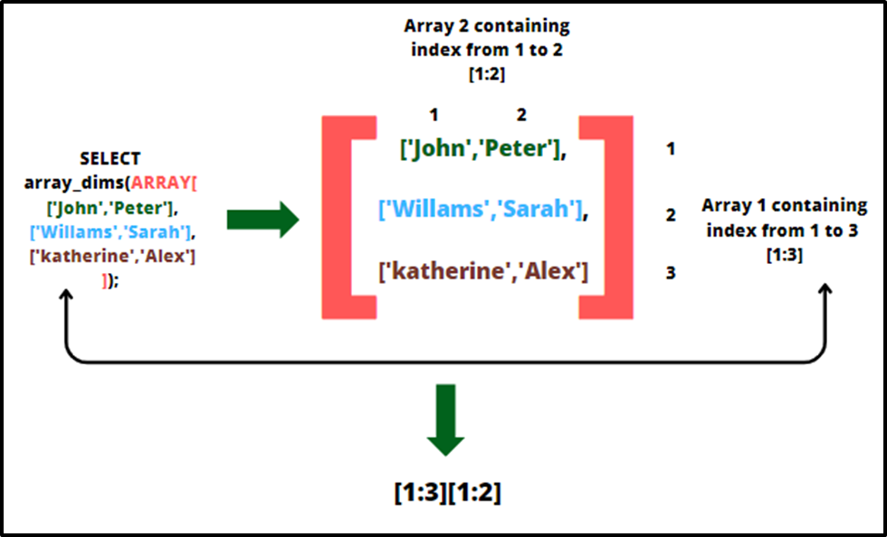 SELECT array_dims(ARRAY[ ['John','Peter'], ['Willams','Sarah'], ['katherine','Alex'] ]);